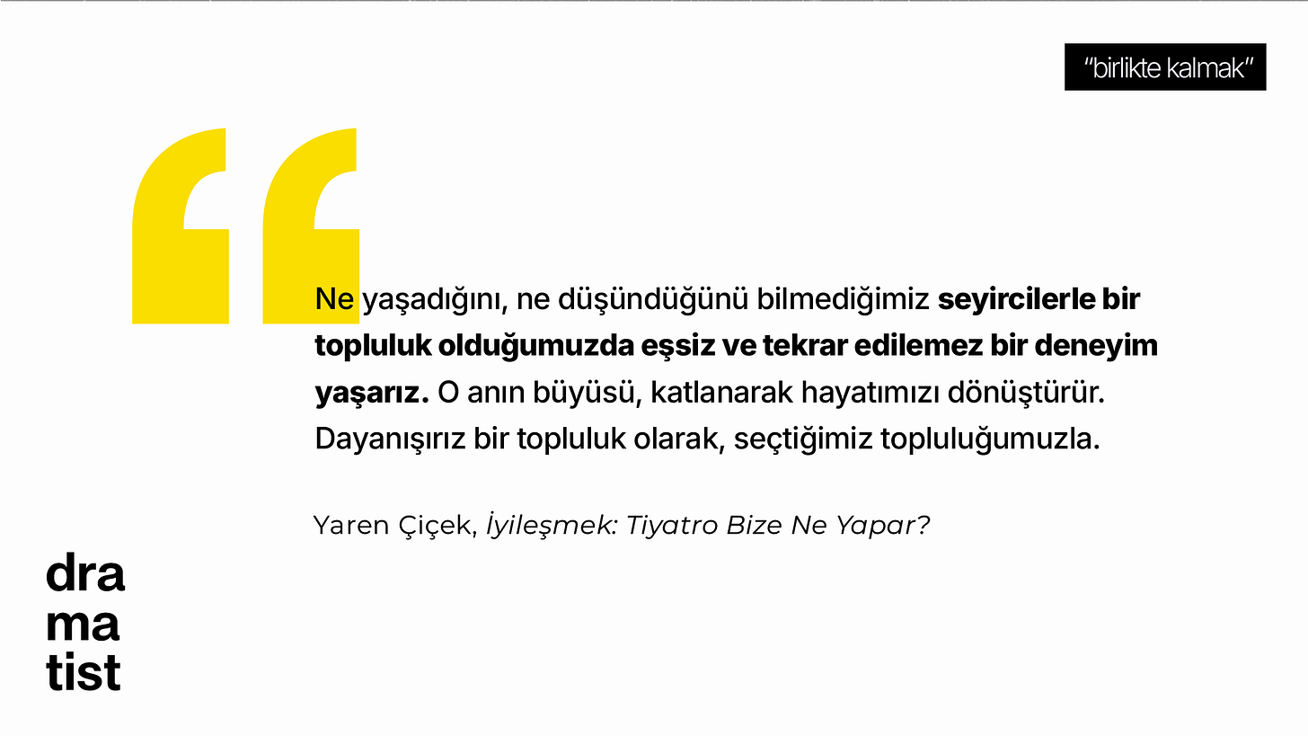 Bu cümlenin hem o an bende bıraktığı etki hem de yıllar sonra hatırlamanın verdiği hisler bir yana dursun, tiyatroyu, tiyatro sayesinde tanıdığım insanları, tiyatrodan öğrendiklerimi, tüm bu toplum ve topluluk meselesini ve kurgusal metinleri neden bir iyileşme alanı olarak gördüğümün (ve insanların neden böyle ifade ettiğinin) karşılığını şu paragrafta buldum:
