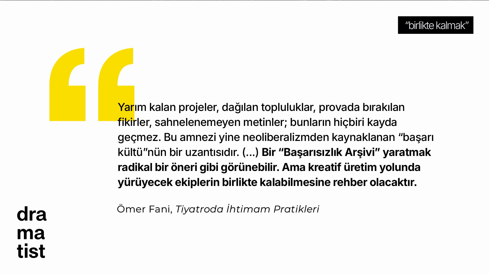 Tiyatro, -nadir de olsa- ancak başarılı hikâyeleri arşivler: prömiyer haberleri, eleştiri yazıları, ödüller, fotoğraflar, röportajlar, podcastler. Ama rağbet görmemişleri kesinlikle unutur. Onlar yok hükmündedir. Yarım kalan projeler, dağılan topluluklar, provada bırakılan fikirler, sahnelenemeyen metinler; bunların hiçbiri kayda geçmez. Bu amnezi yine neoliberalizmden kaynaklanan “başarı kültü”nün bir uzantısıdır. Başarısız olmak -tıpkı yukarıda değindiğimiz yavaşlamak ve duraksamak gibi- konuşulmaması gereken bir utançtır. Bir “Başarısızlık Arşivi” yaratmak radikal bir öneri gibi görünebilir. Ama kreatif üretim yolunda yürüyecek ekiplerin birlikte kalabilmesine rehber olacaktır.